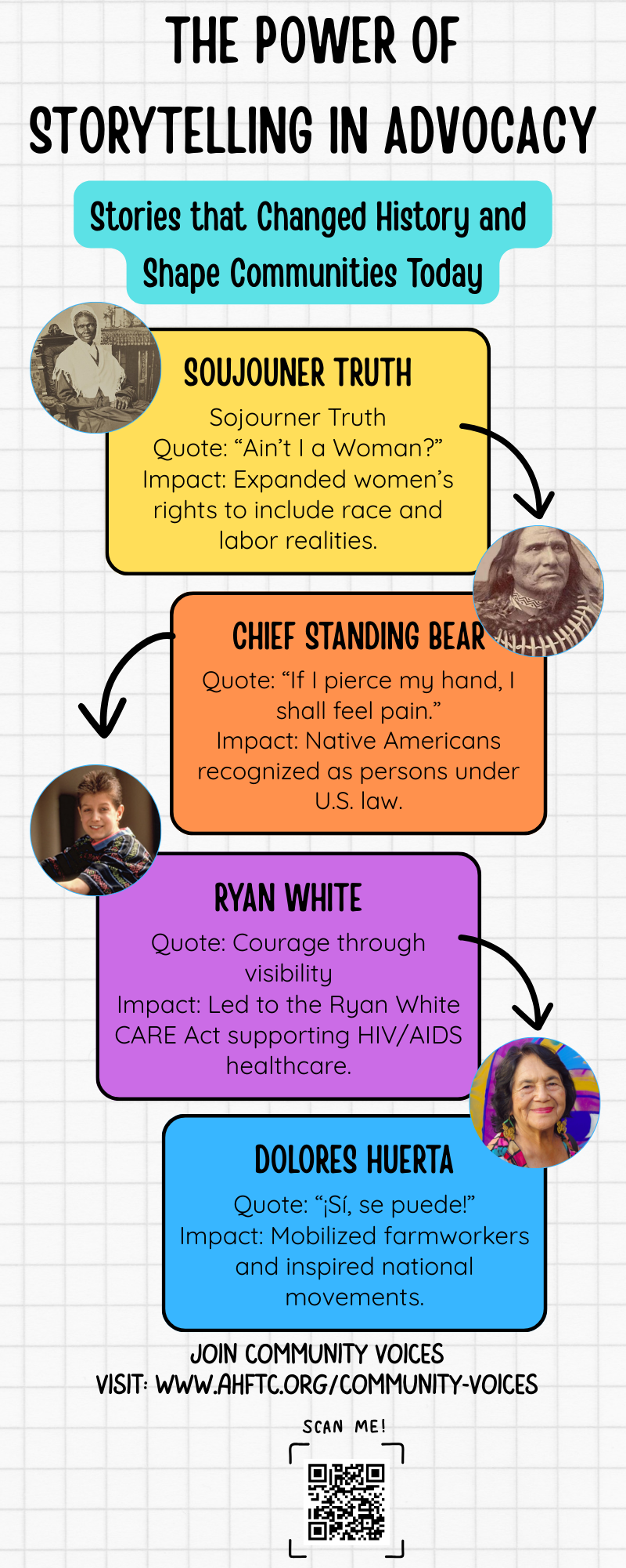 Hunter opened the session by explaining how storytelling has shaped pivotal moments in American history, referencing leaders such as Sojourner Truth, Chief Standing Bear, Ryan White, and Dolores Huerta. These examples reinforced that stories have the power to influence policy and create lasting change.